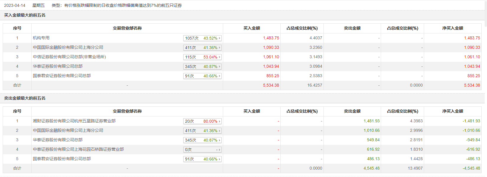 具体来看,机构合计净买入1483.75万元。此外,湘财证券杭州五星路证券营业部、中国国际金融上海分公司分别卖出1481.93万元、1010.66万元;中国国际金融上海分公司、中信证券总部(非营业场所)分别买入1090.33万元、1061.10万元。
