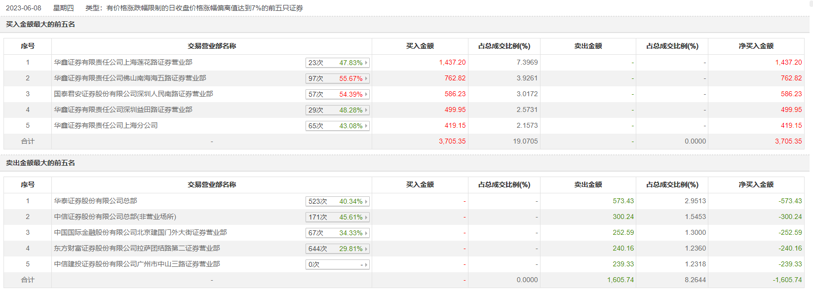 具体来看,华鑫证券上海莲花路证券营业部、华鑫证券佛山南海海五路证券营业部分别买入1437.20万元、762.82万元;华泰证券总部、中信证券总部(非营业场所)分别卖出573.43万元、300.24万元。
