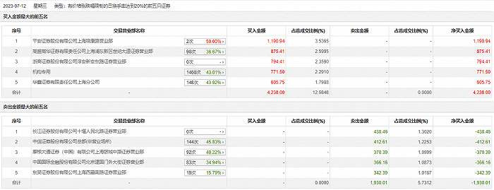 江苏华辰7月12日涨停,龙虎榜数据显示,上榜营业部席位全天成交6168.01万元,占当日总成交金额比例为18.32%。其中,买入金额为4238.0万元,卖出金额为1930.01万元,合计净买入2307.99万元。