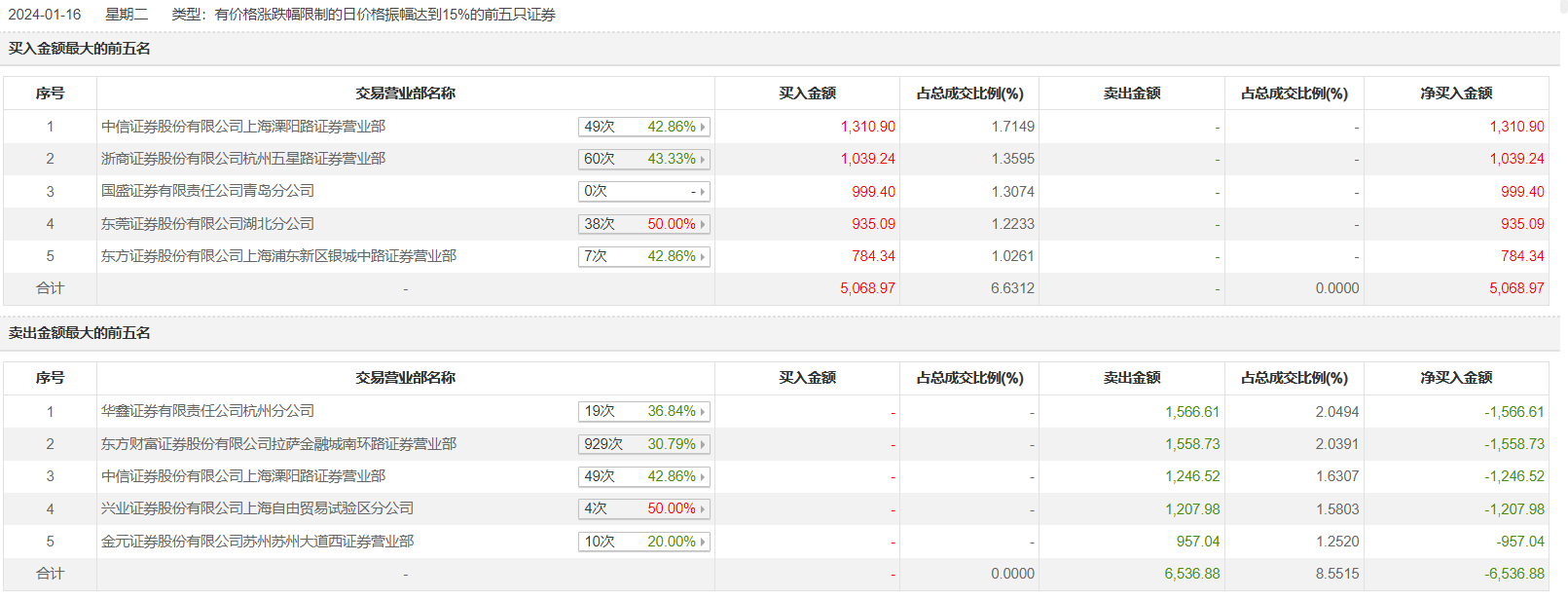 江苏华辰1月16日涨停,龙虎榜数据显示,上榜营业部席位全天成交1.16亿元,占当日总成交金额比例为15.18%。其中,买入金额为5068.97万元,卖出金额为6536.88万元,合计净卖出1467.91万元。