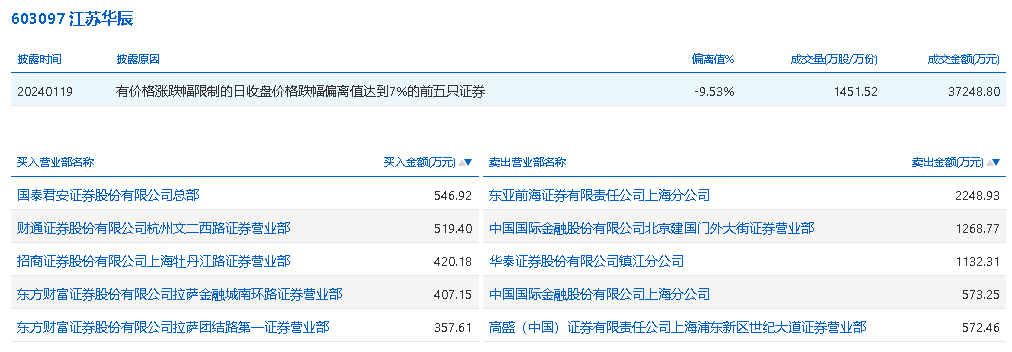 1月19日,江苏华辰今日跌停,全天换手率达36.29%,振幅达8.21%。龙虎榜数据显示,营业部席位合计净卖出3544.47万元。其中,东亚前海证券上海分公司、中国国际金融北京建国门外大街证券营业部分别卖出2248.93万元、1268.77万元;国泰君安证券总部、财通证券杭州文二西路证券营业部分别买入546.92万元、519.40万元。