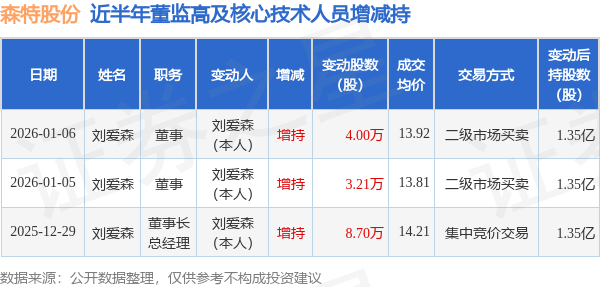 森特股份:1月5日至1月6日高管刘爱森增持股份合计7.21万股