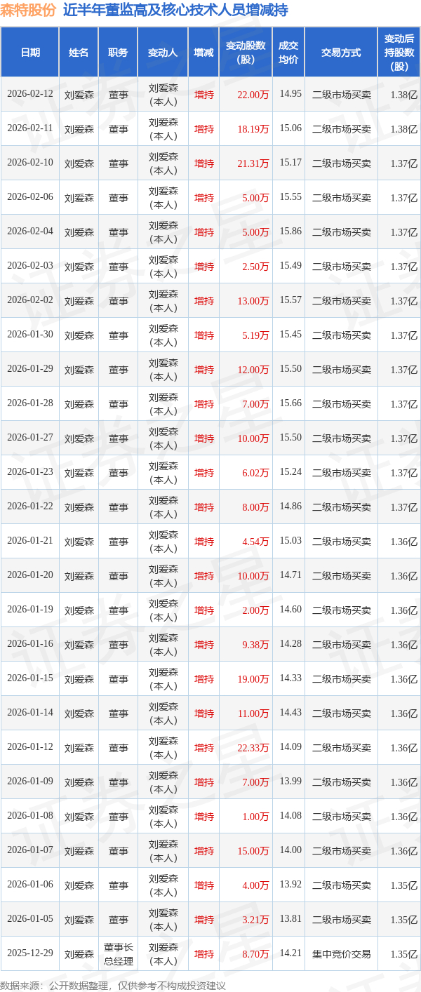 森特股份:2月12日高管刘爱森增持股份合计22万股