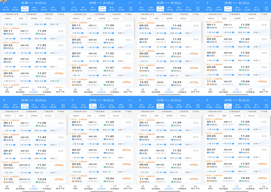 这张考卷,其实早早就有了答案。9月29日22时,记者打开12306购票平台查询沈阳北站至长白山站的高铁票务数据后,发现从10月1日至10月8日,每天上午的车次均已显示售罄或候补,沈佳高铁沈白段(下称沈白高铁)呈现出一票难求的场面,10月11日后,购票紧张的情况才稍有缓解。