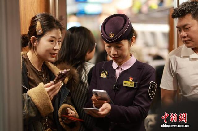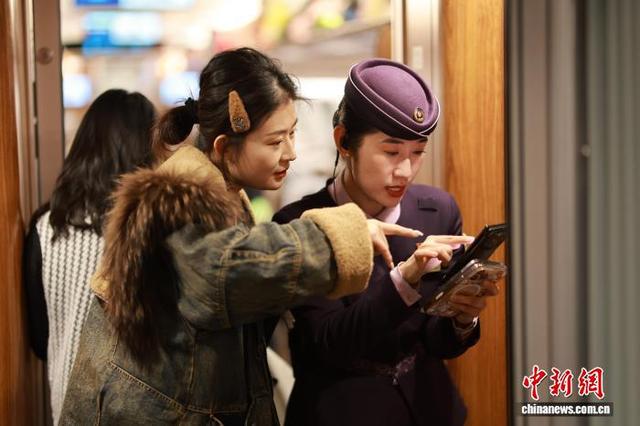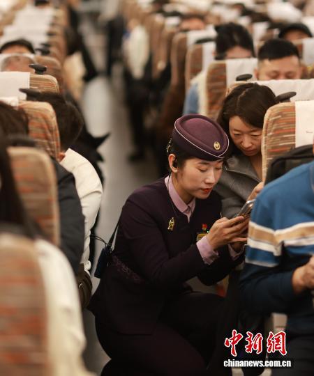 2月13日,正午时分,G3551次列车准点驶出北京朝阳站,向着长白山站疾驰。这趟京哈高铁上的“极速纽带”,在春运期间千里轨道上书写着沈阳客运段的服务精魂。沈阳客运段动车二队列车长王百慧,她带头研发出“五彩丝带”服务法,用不同颜色丝带为重点旅客搭建“无声绿色通道”。据了解,北京朝阳至长白山G3551次列车,由中国铁路沈阳局集团有限公司沈阳客运段担当乘务,车型为复兴号智能动车组。让“人民铁路为人民”的誓言,绽放出永不褪色的光彩。图为王百慧在车厢教旅客如何在12306上订餐。中新社记者 于海洋 摄