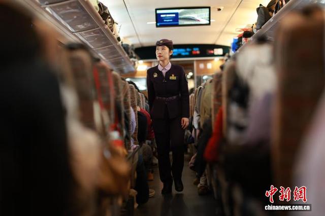2月13日,正午时分,G3551次列车准点驶出北京朝阳站,向着长白山站疾驰。这趟京哈高铁上的“极速纽带”,在春运期间千里轨道上书写着沈阳客运段的服务精魂。沈阳客运段动车二队列车长王百慧,她带头研发出“五彩丝带”服务法,用不同颜色丝带为重点旅客搭建“无声绿色通道”。据了解,北京朝阳至长白山G3551次列车,由中国铁路沈阳局集团有限公司沈阳客运段担当乘务,车型为复兴号智能动车组。让“人民铁路为人民”的誓言,绽放出永不褪色的光彩。图为王百慧巡视车厢。中新社记者 于海洋 摄