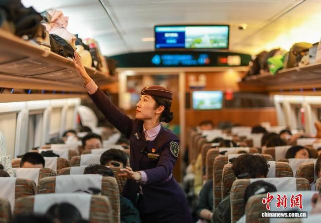 2月13日,正午时分,G3551次列车准点驶出北京朝阳站,向着长白山站疾驰。这趟京哈高铁上的“极速纽带”,在春运期间千里轨道上书写着沈阳客运段的服务精魂。沈阳客运段动车二队列车长王百慧,她带头研发出“五彩丝带”服务法,用不同颜色丝带为重点旅客搭建“无声绿色通道”。据了解,北京朝阳至长白山G3551次列车,由中国铁路沈阳局集团有限公司沈阳客运段担当乘务,车型为复兴号智能动车组。让“人民铁路为人民”的誓言,绽放出永不褪色的光彩。图为王百慧在车厢整理行李架。中新社记者 于海洋 摄