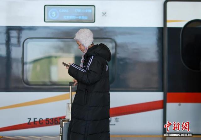 2月13日,正午时分,G3551次列车准点驶出北京朝阳站,向着长白山站疾驰。这趟京哈高铁上的“极速纽带”,在春运期间千里轨道上书写着沈阳客运段的服务精魂。沈阳客运段动车二队列车长王百慧,她带头研发出“五彩丝带”服务法,用不同颜色丝带为重点旅客搭建“无声绿色通道”。据了解,北京朝阳至长白山G3551次列车,由中国铁路沈阳局集团有限公司沈阳客运段担当乘务,车型为复兴号智能动车组。让“人民铁路为人民”的誓言,绽放出永不褪色的光彩。图为旅客在北京朝阳站乘车。中新社记者 于海洋 摄