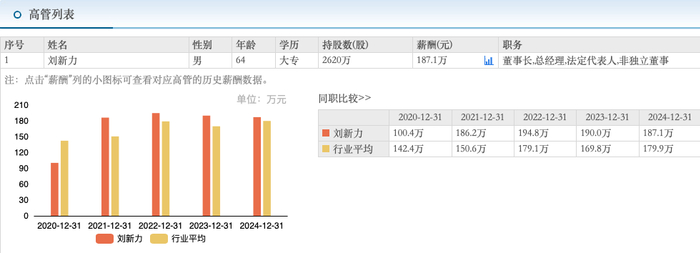 东方财富数据显示,2020年至2024年,刘新力的薪酬分别为100.4万元、186.2万元、194.8万元、190.0万元、187.1万元。连续两年降薪。