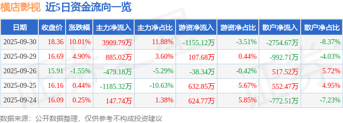 证券之星消息,横店影视9月30日涨停收盘,收盘价18.36元。该股于14点45分涨停,未打开涨停,截止收盘封单资金为1.27亿元,占其流通市值1.09%。