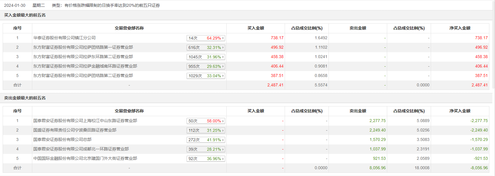 具体来看,知名游资现身龙虎榜,国泰君安证券上海松江中山东路证券营业部、宁波桑田路(国盛证券宁波桑田路证券营业部)分别卖出2277.75万元、2249.40万元;华泰证券镇江分公司、东方财富证券拉萨团结路第一证券营业部分别买入738.17万元、496.92万元。