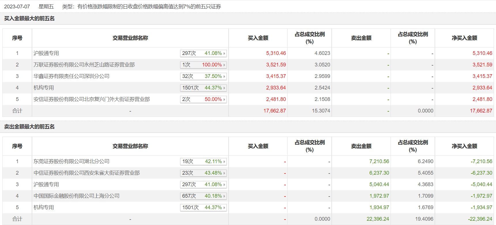 润达医疗7月7日跌停,龙虎榜数据显示,上榜营业部席位全天成交4.01亿元,占当日总成交金额比例为34.72%。其中,买入金额为1.77亿元,卖出金额为2.24亿元,合计净卖出4733.37万元。