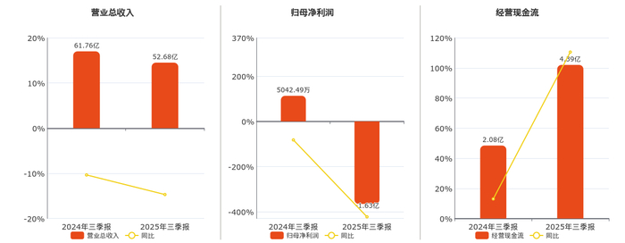 公司营业总收入为52.68亿元,在已披露的同业公司中排名第19,较去年同报告期营业总收入减少9.08亿元,同比较去年同期下降14.70%。归母净利润为-1.63亿元,在已披露的同业公司中排名第24,较去年同报告期归母净利润减少2.13亿元,同比较去年同期下降422.64%。经营活动现金净流入为4.39亿元,在已披露的同业公司中排名第9,较去年同报告期经营活动现金净流入增加2.30亿元,实现3年连续上涨,同比较去年同期上涨110.54%。