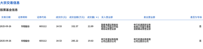 9月26日,华翔股份大宗交易成交76.71万股,成交额1114.56万元,占当日总成交额的3.11%,成交价14.53元,较市场收盘价16.82元折价13.61%。