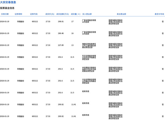 1月19日,华翔股份大宗交易成交114.82万股,成交额2012.82万元,占当日总成交额的8.66%,成交价17.53元,较市场收盘价19.5元折价10.1%。