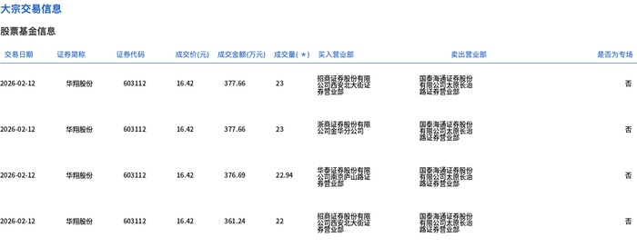 2月12日,华翔股份大宗交易成交90.94万股,成交额1493.25万元,占当日总成交额的15.77%,成交价16.42元,较市场收盘价17.79元折价7.7%。