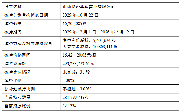 根据公告,公司于2025年10月22日披露了《山西华翔集团股份有限公司控股股东减持股份计划公告》,控股股东山西临汾华翔实业有限公司(以下简称“华翔实业”)拟自该公告披露之日起15个交易日后的3个月内,通过集中竞价、大宗交易方式减持其所持有的公司无限售条件流通股合计不超过16,205,116股,即不超过公司总股本的3%。