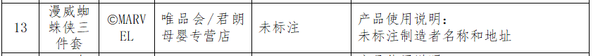又如标称商标为MARVEL的漫威蜘蛛侠三件套产品使用说明未标注制造者名称和地址。