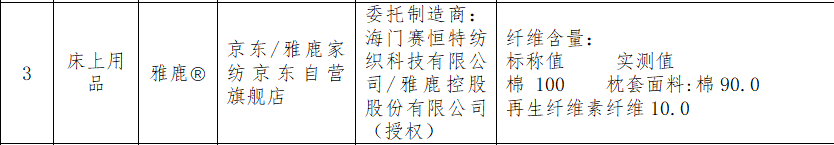 如一款标称委托制造商为海门赛恒特纺织科技有限公司/雅鹿控股股份有限公司(授权)的雅鹿床上用品,纤维含量标称值为棉100%,枕套面料实测为棉90%,再生纤维素纤维10%。