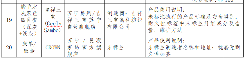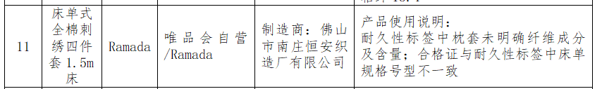诸如标称商品为Ramada的四件套耐久性标签中枕套未明确纤维成分及含量;合格证与耐久性标签中床单规格号型不一致。