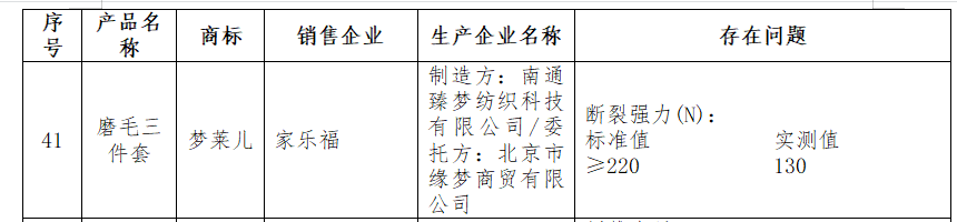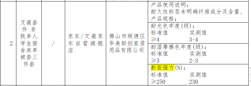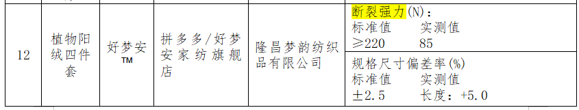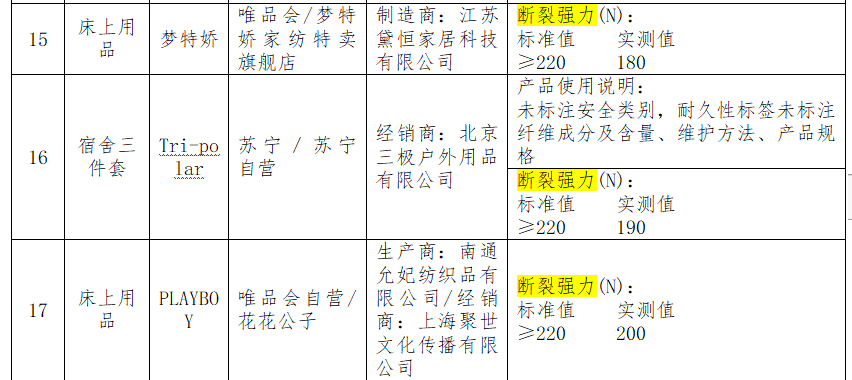 此次检测中,有多款产品断裂强力实测值低于标准值(≥220N)。如标称商标为好梦安、梦特娇、Tri-polar、playboy、梦莱儿等多款床上用品断裂强力未达标。