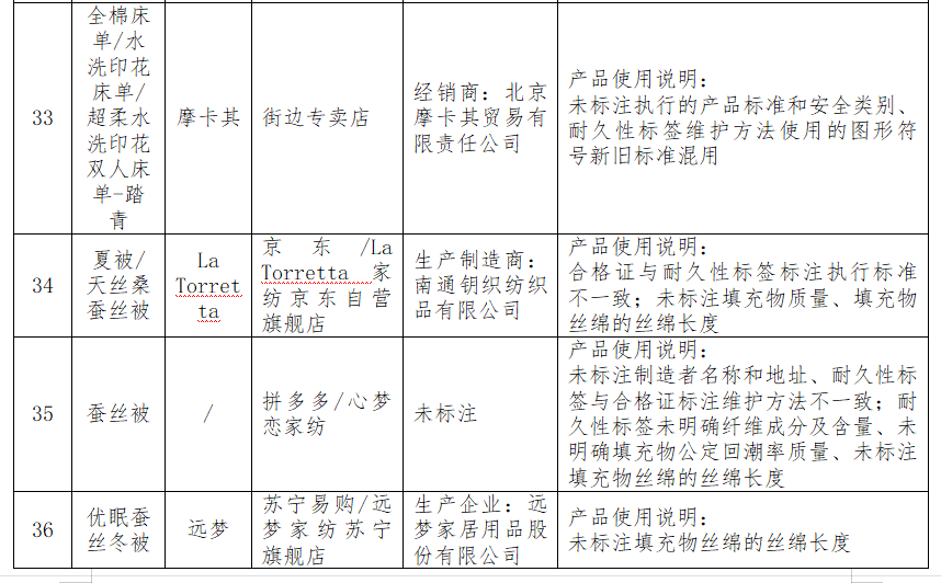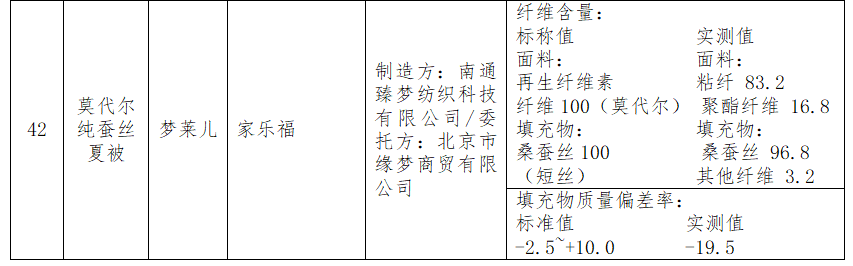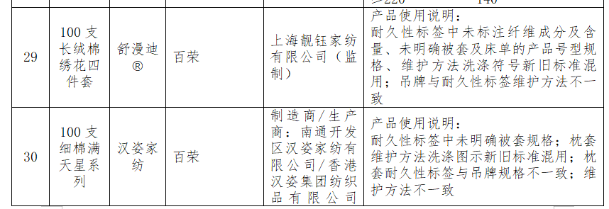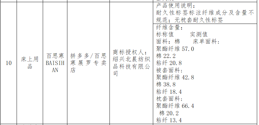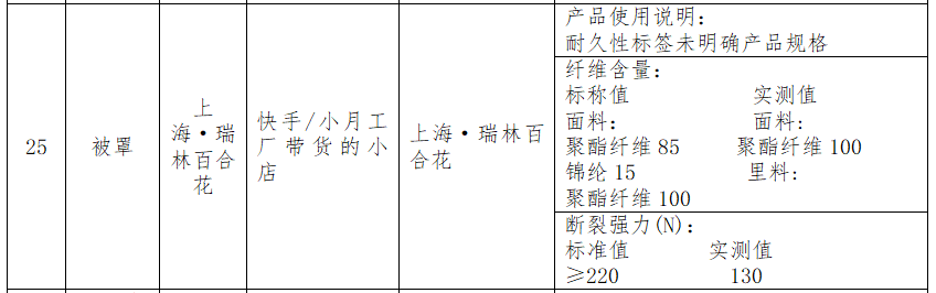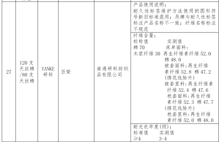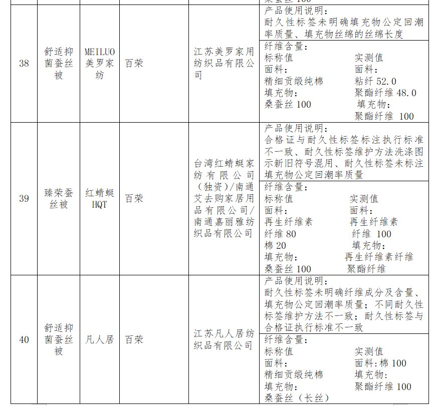 另外,标称商标为百思寒、悦达家纺、上海·瑞林百合花、研科、美罗家纺、红蜻蜓、凡人居、梦莱儿等床上用品也被检出纤维含量实测值与标称不符。