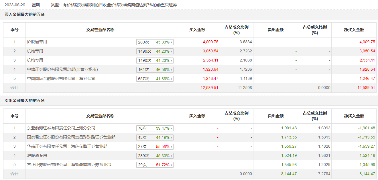 共进股份6月26日跌停,龙虎榜数据显示,上榜营业部席位全天成交2.07亿元,占当日总成交金额比例为18.53%。其中,买入金额为1.26亿元,卖出金额为8144.47万元,合计净买入4445.03万元。