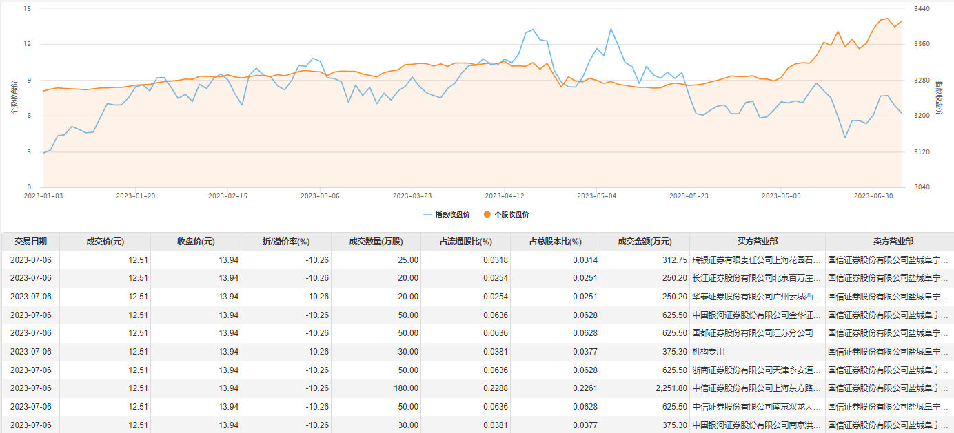 7月6日大宗交易成交505万股,成交额6317.55万元,占当日总成交额的7.01%,成交价12.51元,较市场收盘价13.94元折价10.26%。