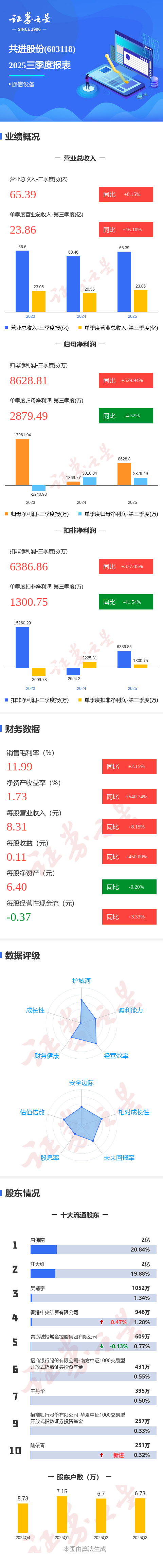 图解共进股份三季报:第三季度单季净利润同比下降4.53%