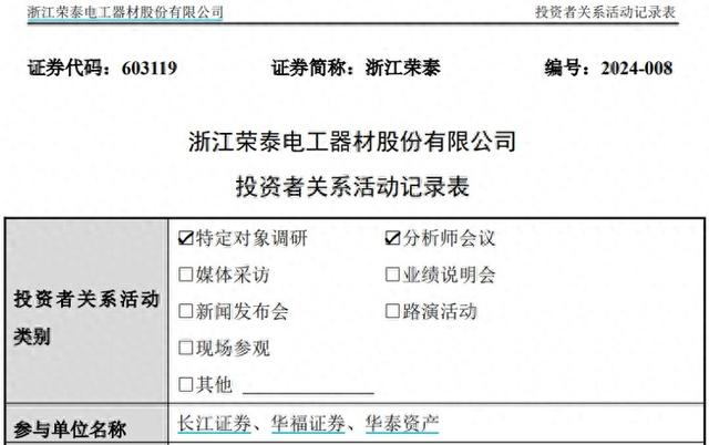 【环球网财经综合报道】9月9日盘后,上市公司浙江荣泰(603119.SH)发布了《投资者关系活动记录表》,披露接待了长江证券、华福证券、华泰资产等3家投资机构代表的调研,公司财务总监、董事会秘书陈弢出席并解答投资代表提问。