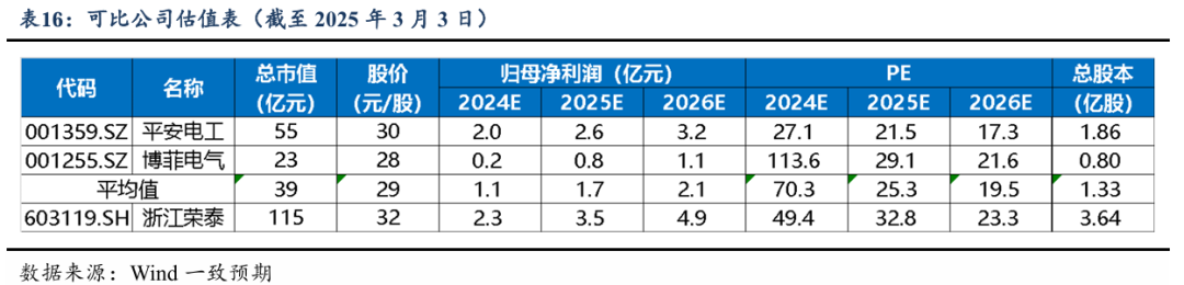 行业格局稳定,公司在新能源汽车领域市占率维持高位。根据弗若斯特沙利文市场空间测算,浙江荣泰及平安电工新能源汽车业务收入市占率及盈利水平稳定,其中荣泰23年收入6亿元,毛利率45%,预计市占率26%左右,维持全球龙头地位,平安电工收入1.2亿元,毛利率38%,预计市占率5%。