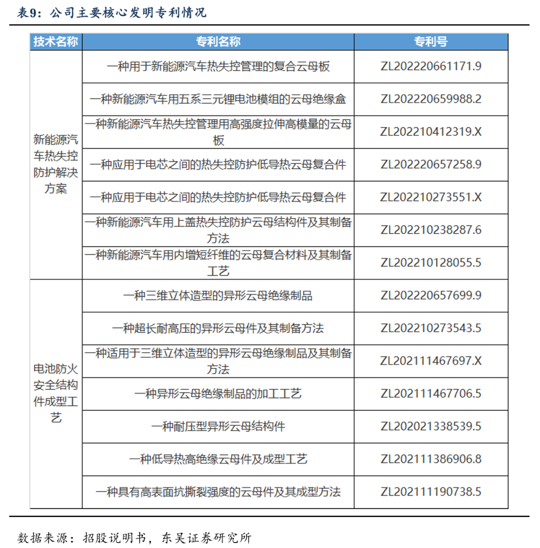 公司主营业务为各类耐高温绝缘云母制品的研发、生产和销售,主要在新能源汽车、小家电、电线电缆等下游行业应用。2003年公司正式成立,专注于耐高温绝缘云母制品的研发、生产和销售,2005年公司通过ISO 9001质量管理体系认证,2013年公司开始研发新能源汽车防火安全件,2018年公司开始为各大车企定制新能源汽车热失控管理解决方案,目前已成为特斯拉、大众、宝马、沃尔沃新能源汽车热失控防护绝缘件主要供应商,公司被沃尔沃评选为“2021年度最佳供应商”,2022年被沃尔沃授予“质量卓越奖”。2023年公司在上交所上市。