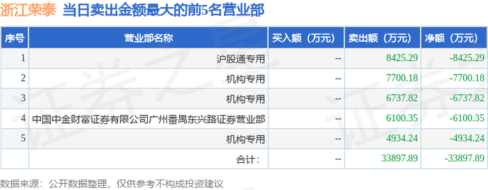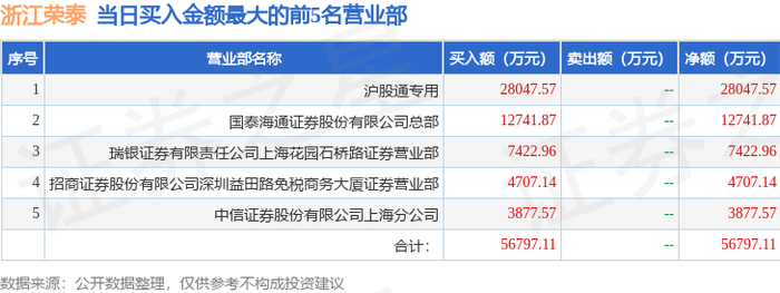 10月14日浙江荣泰(603119)龙虎榜数据:机构净卖出1.94亿元,北向资金净买入1.96亿元