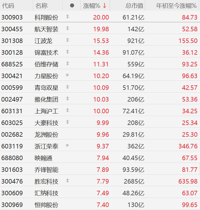 格隆汇10月24日|A股机器人概念股集体走强,其中,科翔股份、航天智装20CM涨停,江波龙涨超15%,锦富技术涨超14%,佰维存储涨超11%,力星股份涨超11%,青岛双星、雅化集团、上海沪工、大豪科技、龙洲股份10CM涨停,浙江荣泰逼近涨停。