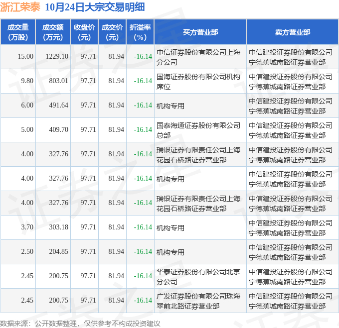 10月24日浙江荣泰现11笔折价16.14%的大宗交易 合计成交4826.26万元