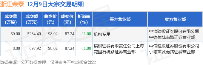 12月9日浙江荣泰现2笔折价11%的大宗交易 合计成交5932.32万元