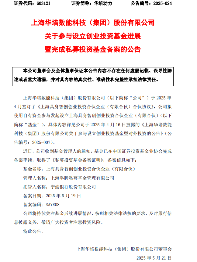 5月20日,华培动力(603121.SH)公告称,公司于2025年4月签订《上海具身智创创业投资合伙企业(有限合伙)合伙协议》拟使用自有资金参与发起设立该基金,近日收到基金管理人通知,基金已在中国证券投资基金业协会完成备案手续,取得《私募投资基金备案证明》,备案信息包括基金名称为上海具身智创创业投资合伙企业(有限合伙),管理人名称为上海孚腾私募基金管理有限公司,托管人名称为宁波银行股份有限公司,备案日期为2025年5月19日,备案编码为SAYE08。