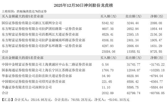 卖出前5席为:开源证券股份有限公司西安西大街证券营业部、国泰海通证券股份有限公司上海松江区中山东路证券营业部、国泰海通证券股份有限公司上海长宁区江苏路证券营业部、东方财富证券股份有限公司拉萨团结路第一证券营业部、沪股通专用。共计买入:0万元,共计卖出:37239.84万元。