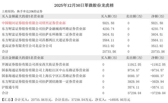 买入前5席为:中国银河证券股份有限公司绍兴证券营业部、东方财富证券股份有限公司拉萨金融城南环路证券营业部、东方财富证券股份有限公司拉萨东环路第二证券营业部、东方财富证券股份有限公司昌都两江大道证券营业部、麦高证券有限责任公司北京分公司。共计买入:20733.86万元,共计卖出:0万元。