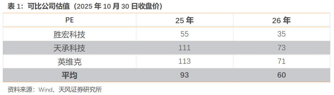 我们选取PCB产业链胜宏股份、天承科技,液冷产业链英维克作为可比公司,根据Wind一致预期,三家公司2025、2026年平均估值为93、60X,考虑到公司在产业链的地位和未来几年业绩成长性,给予26年估值35X,目标价112元,首次覆盖,给予“买入”评级。