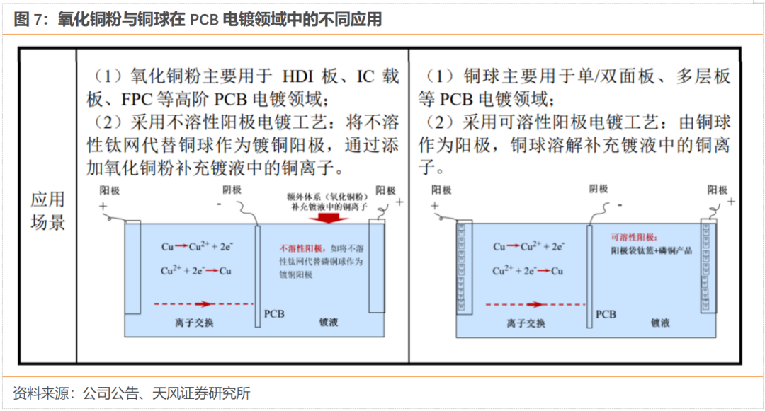 下游高阶PCB需求等发展驱动公司产品由铜球向铜粉升级。氧化铜粉与铜球均可用于PCB铜电镀领域,起到补充镀液中铜离子的作用。不同的是氧化铜粉电镀工艺具有更高的制程能力、更稳定的电镀均匀性、更高的生产效率、更稳定的制程管控,主要用于对精密度要求更高的HDI板、IC载板、FPC等高阶PCB领域的电镀环节;铜球主要用于对精密度要求不及高阶PCB电镀要求的单/双面板、多层板等PCB电镀环节。