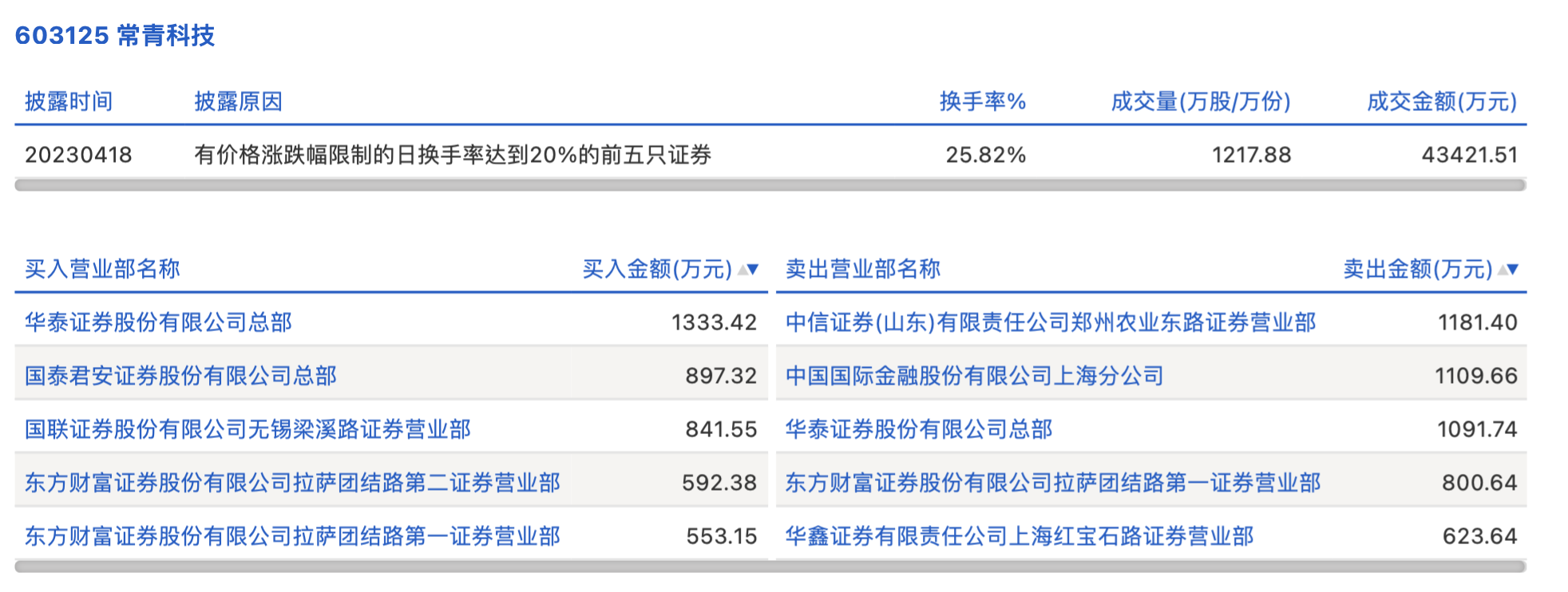 4月18日,常青科技今日涨1.04%,龙虎榜数据显示,上榜营业部席位全天成交9024.9万元,占当日总成交金额比例为20.78%。其中,买入金额为4217.81万元,卖出金额为4807.08万元,合计净卖出589.27万元。