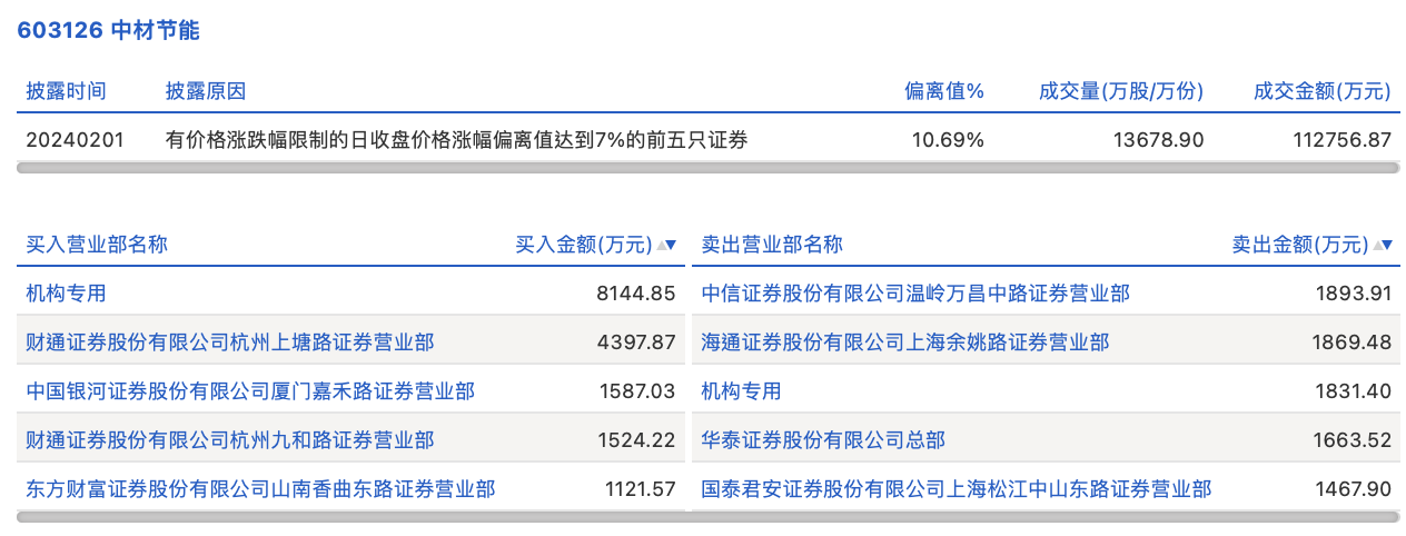 2月1日,中材节能今日涨停,全天换手率达22.41%,振幅达7.54%。龙虎榜数据显示,营业部席位合计净买入8049.34万元。其中,机构买入8144.85万元,卖出1831.4万元,合计净买入6313.45万元。此外,财通证券杭州上塘路证券营业部、中国银河证券厦门嘉禾路证券营业部分别买入4397.87万元、1587.03万元;中信证券温岭万昌中路证券营业部、海通证券上海余姚路证券营业部分别卖出1893.91万元、1869.48万元。