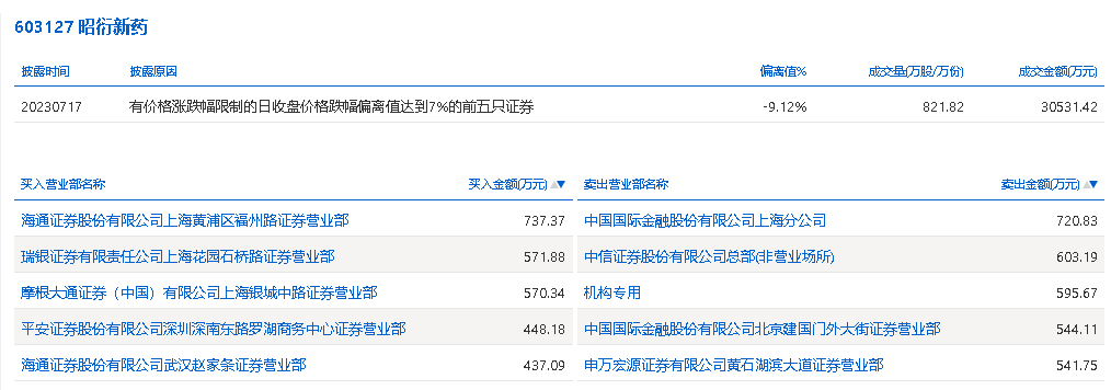 7月17日,昭衍新药今日跌停,龙虎榜数据显示,上榜营业部席位全天成交5770.41万元,占当日总成交金额比例为18.9%。其中,买入金额为2764.86万元,卖出金额为3005.55万元,合计净卖出240.7万元。