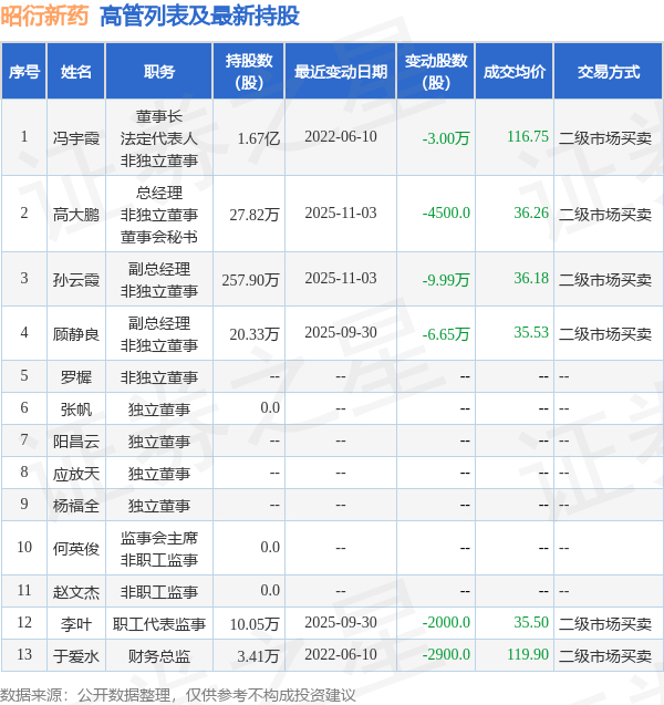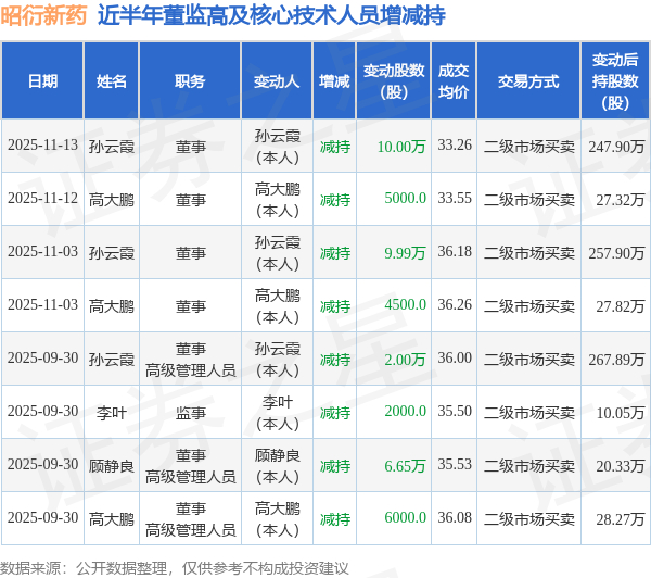 昭衍新药近半年内的董监高及核心技术人员增减持详情如下: