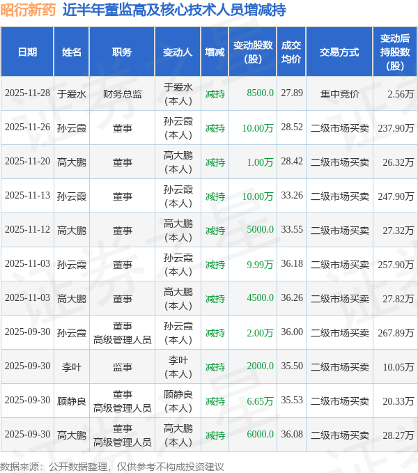 昭衍新药:11月28日高管于爱水减持股份合计8500股