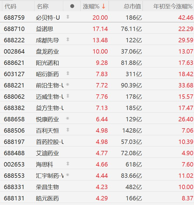 格隆汇1月7日|A股市场创新药概念股集体上涨,其中,必贝特-U 20CM涨停,益诺思涨超17%,成都先导涨超13%,盘龙药业10CM涨停,阳光诺和涨超9%,昭衍新药、前沿生物、迈威生物、益方生物涨超7%,悦康药业涨超6%。