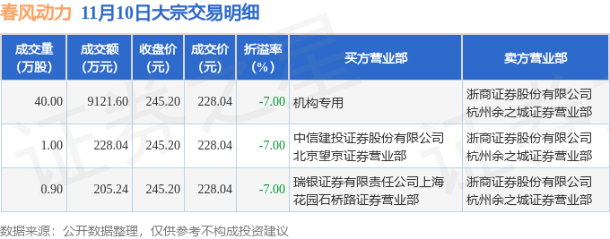 证券之星消息,11月10日春风动力发生大宗交易,交易数据如下: