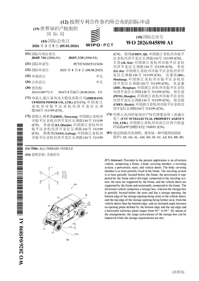 证券之星消息,根据企查查数据显示春风动力(603129)公布了一项国际专利申请,专利名为“全地形车”,专利申请号为PCT/CN2025/113656,国际公布日为2026年3月5日。