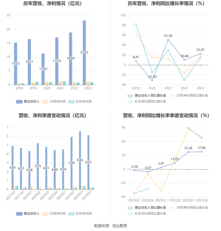 2023年,公司毛利率为10.70%,同比上升1.66个百分点;净利率为5.14%,较上年同期下降0.20个百分点。从单季度指标来看,2023年第四季度公司毛利率为9.32%,同比上升6.10个百分点,环比下降3.18个百分点;净利率为4.65%,较上年同期上升0.88个百分点,较上一季度下降1.52个百分点。